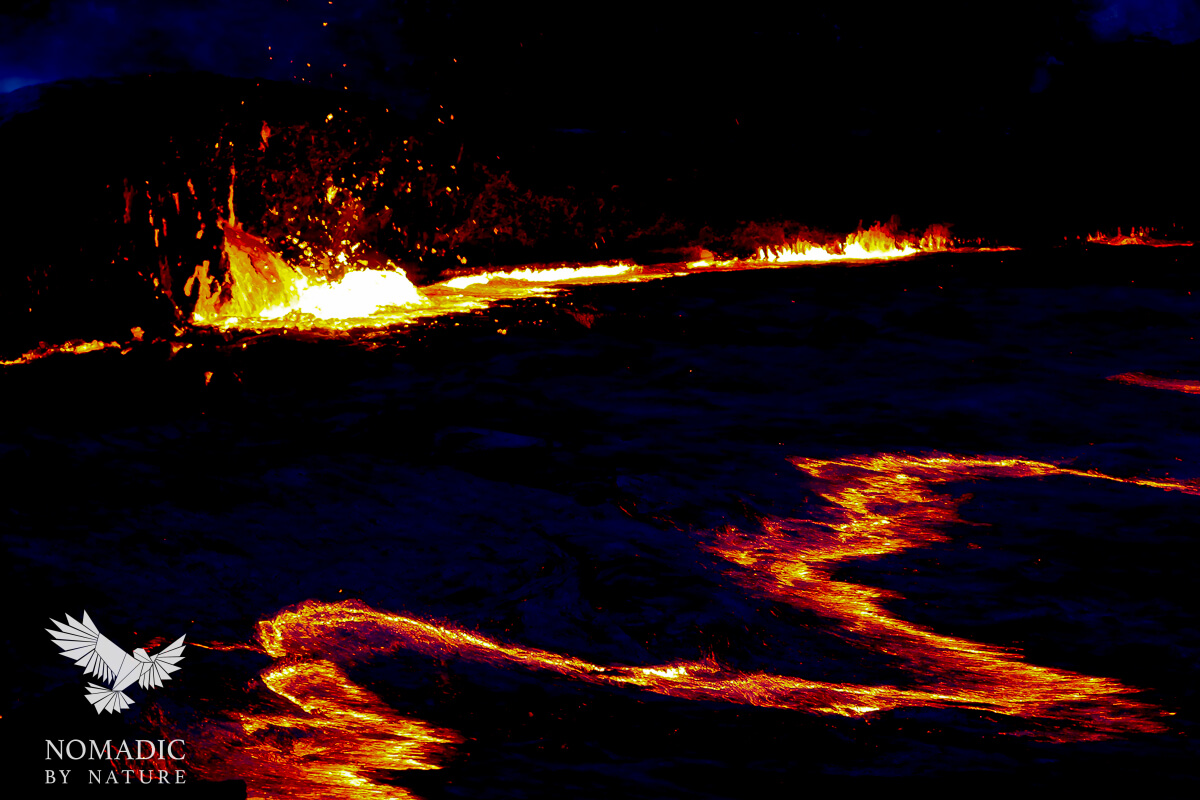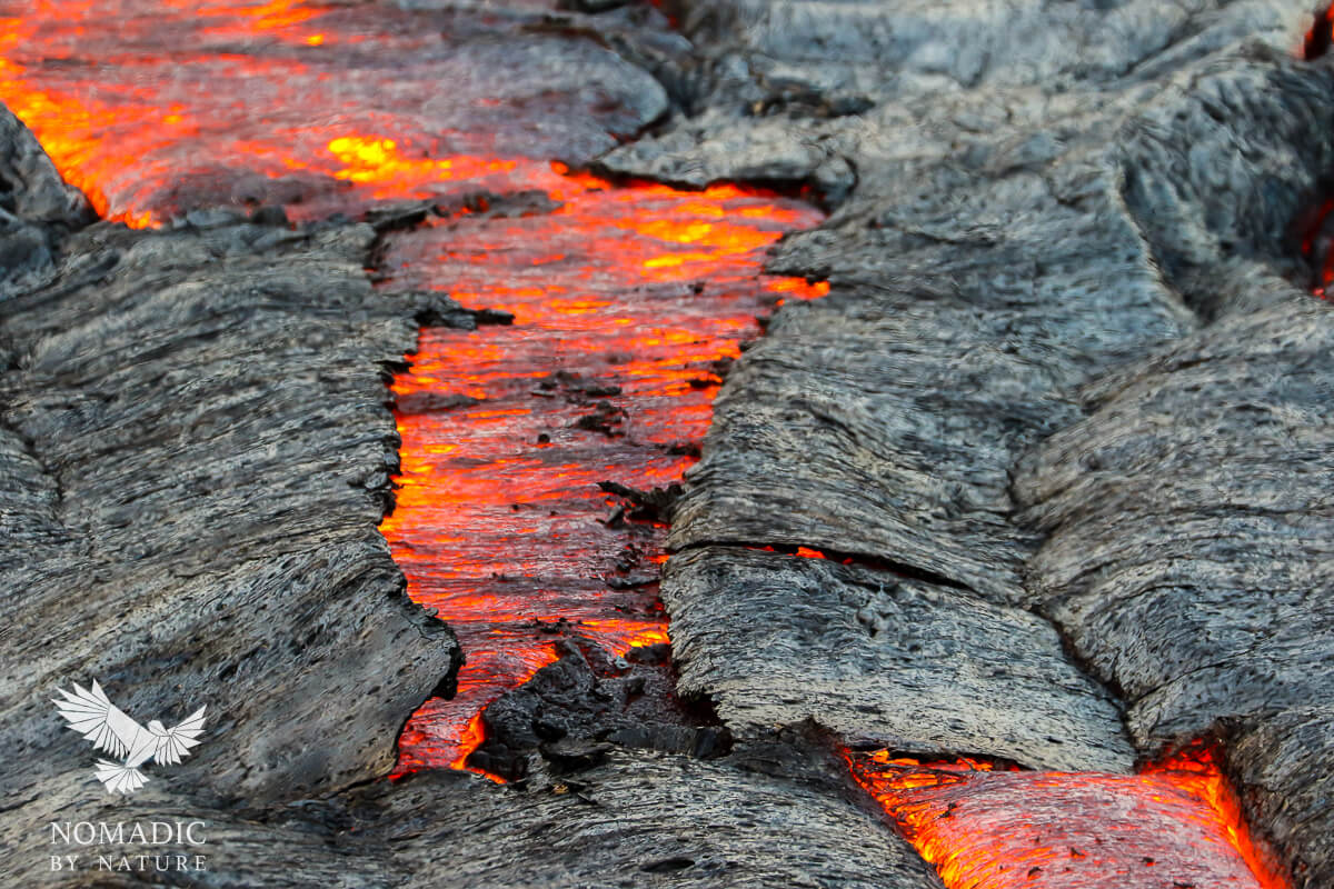While the conditions are brutal, the show is spectacular. It feels like the lake is alive, changing its moods without warning. Sometimes it flows all in one direction, down into a hole at one edge. Then a fissure in the metallic black crust will slowly pry itself open, exposing a shape like a radioactive snake. This is the time to wait and watch until hot molten, the color of the sun, leaps through the chasm like a ballerina on center stage.