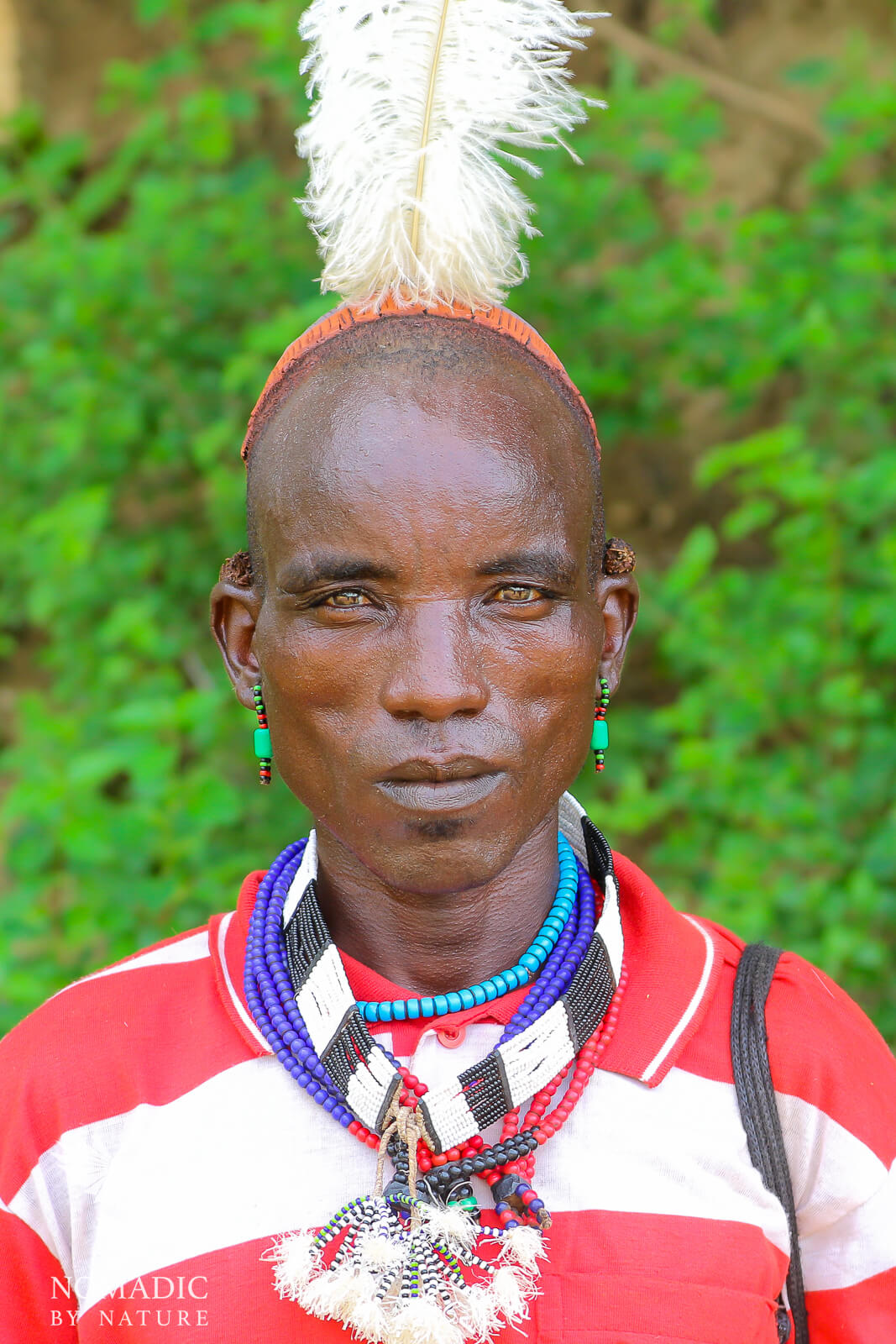 As people finish their chores, and the mid-day heat dissipates, villagers start appearing from the bushes into a clearing, and sitting together on the sandy banks of the Kaske river. The women have tied bunches of small bells to their calves which jingle with each step. Their hair is matted red with ochre like the muddy waters of river, and each one carries a brass horn (called a gola) that looks like a relic from the American civil war. The men look regal with long ostrich feathers stuck into their hair. They sit quietly together snorting snuff, and waiting.