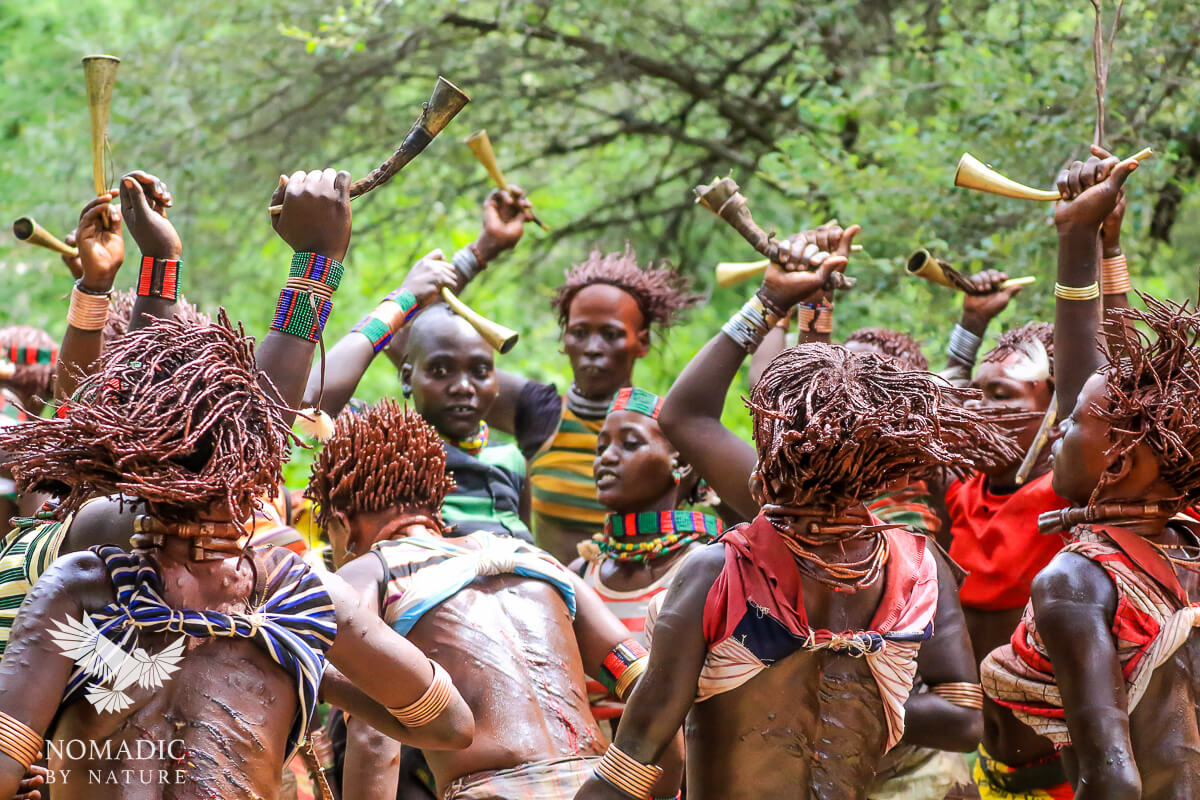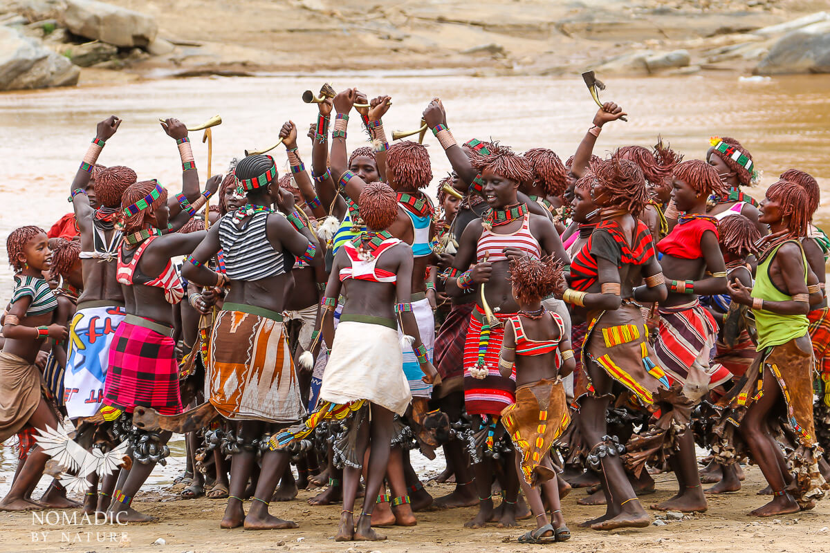 The energy starts increasing. The women’s horns get louder, their jumping higher, and their smiles wider. Yet every time someone is spotted approaching the river valley, all the women charge over in a frenzy to see who it is. They are waiting for men to arrive carrying meter and a half long whips made from young vine-like branches.