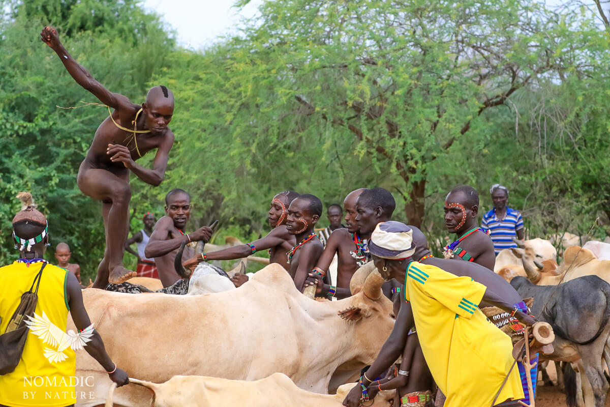 As the whipping ends, cattle are brought out from the bush and lined up side-by-side by men. The boy appears from the bush wearing just a thin reed across his chest. The village gathers around, and the boy leaps across the backs of the bulls, landing barefoot on the ground and turning to repeat the feat. The women cheer in support, and the men struggle to hold the cattle as they try to escape. However, it all seems a little anti-climactic after the performance of the women.