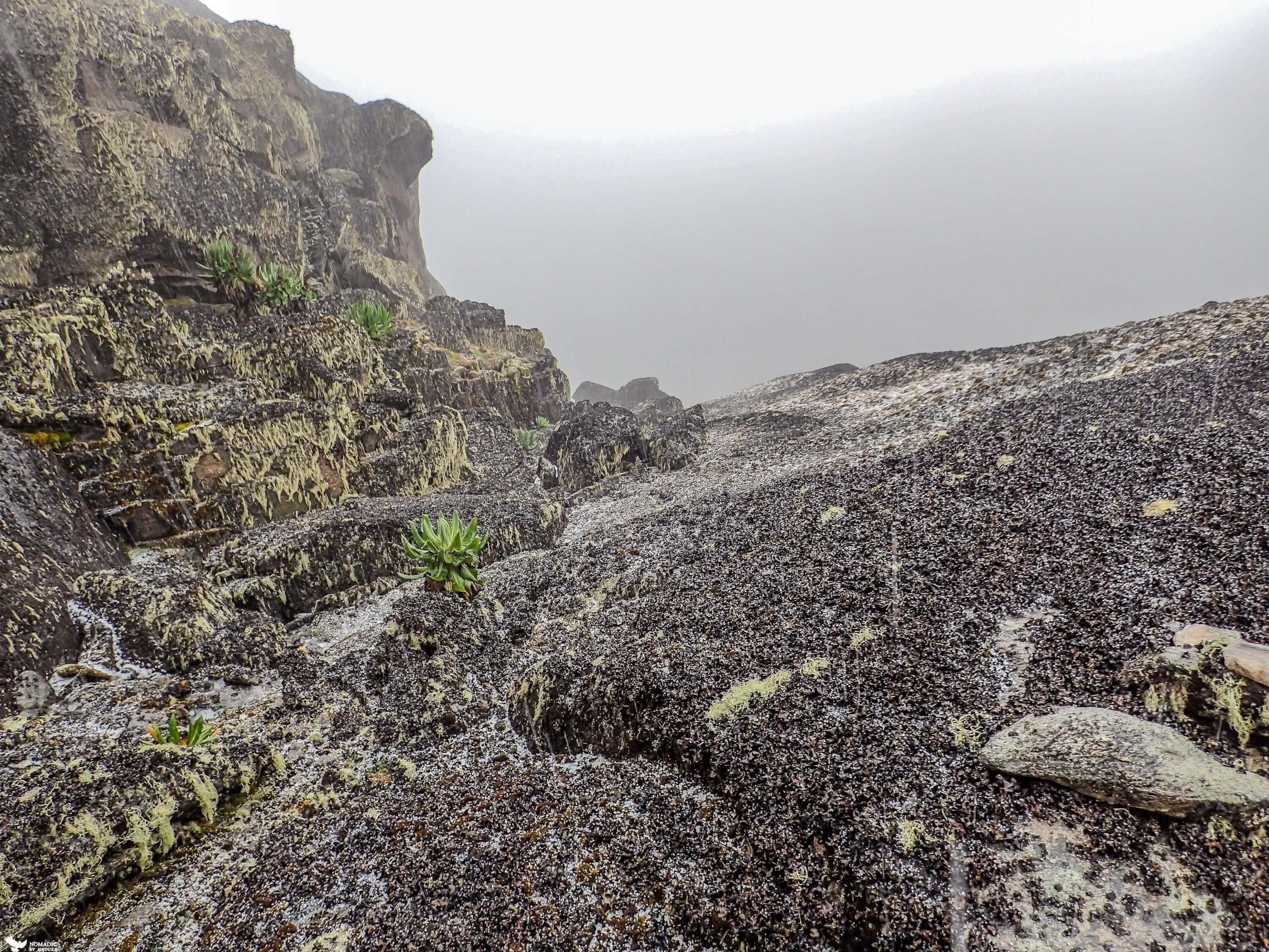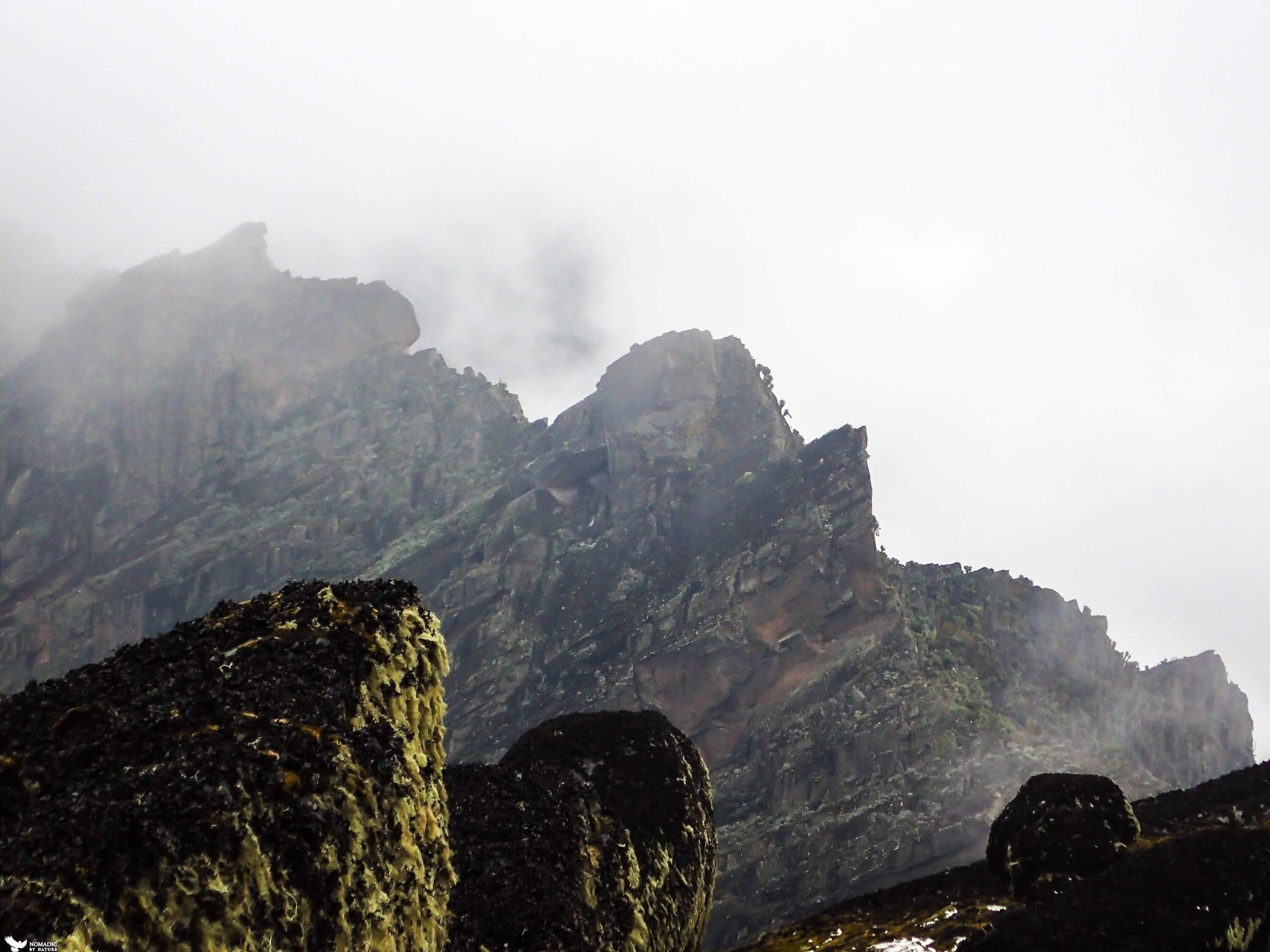 The exertion warms me, and we hardly stop as our body temperatures drop immediately when we do. After a couple hours of scratching upwards, we pull ourselves up and over a final ridge, and see we are now just under Weismann’s peak. The mists are still heavy, and their moisture has created a stark barren environment of rock covered with black lichen like the seaweed around tide pools. It is eerie and quiet, except of the wind. We leave our walking sticks and start climbing over boulders and as we near the top, the black lichen becomes contrasted with patches of bright white equatorial snow.