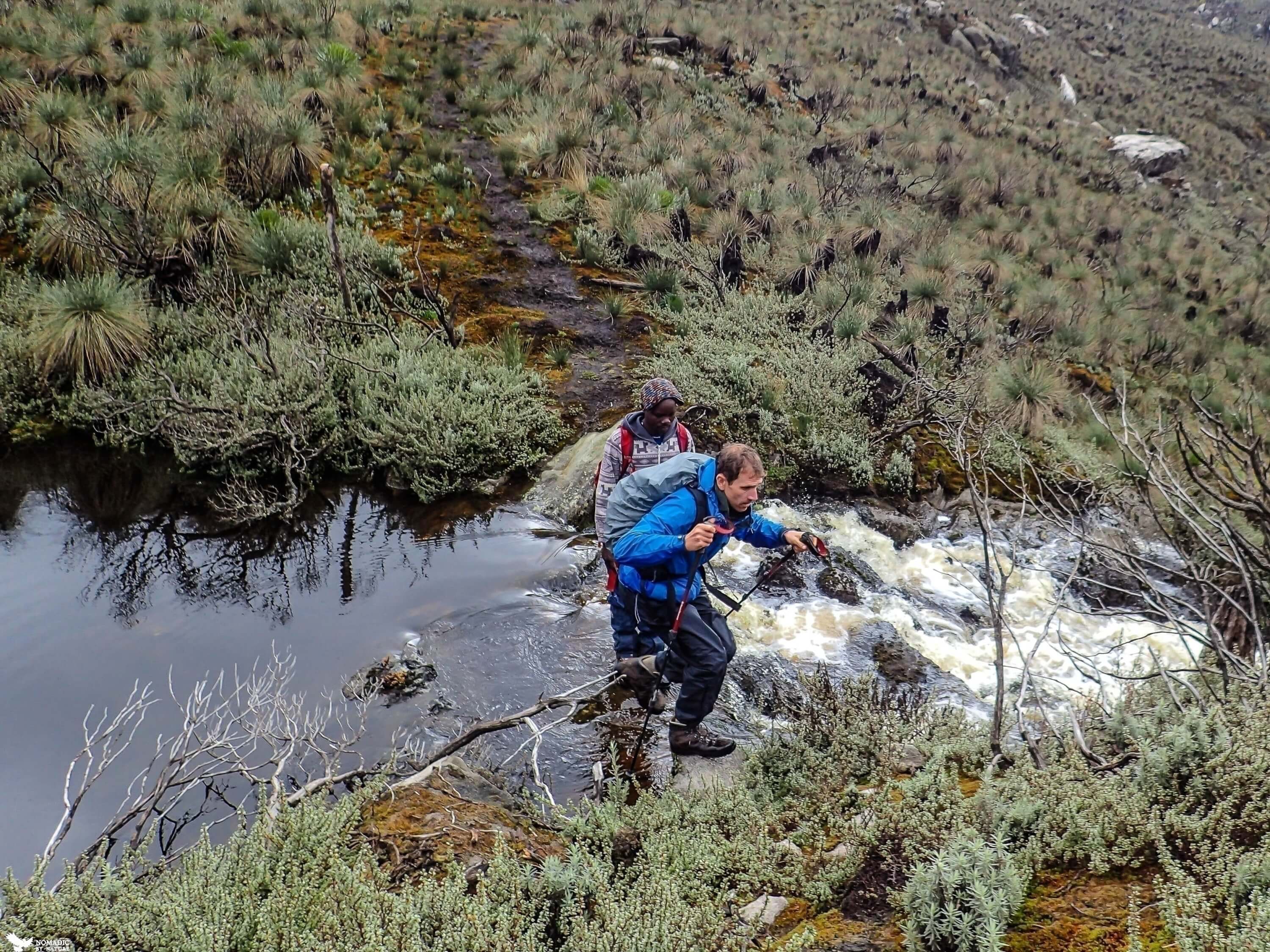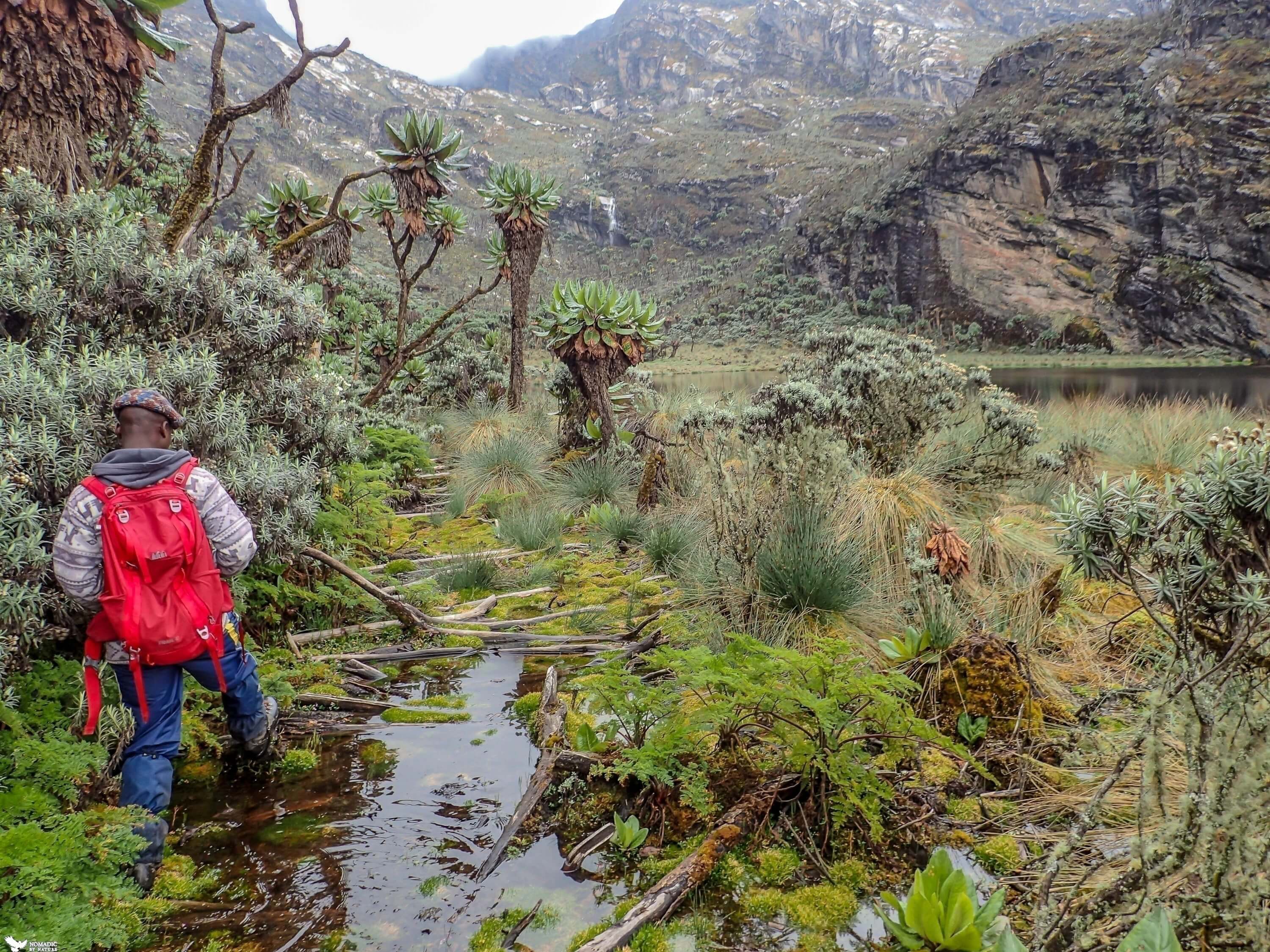 At 9:30 am the rains stop and the winds die down, and Bernard immediately wants us ready to go in five minutes. We bound out of the shelter, and down into the valley of lakes, wishing we could see the weather beyond the surrounding peaks, as we have no idea if we are trudging out into a quiet eye of the storm or if it has really passed.