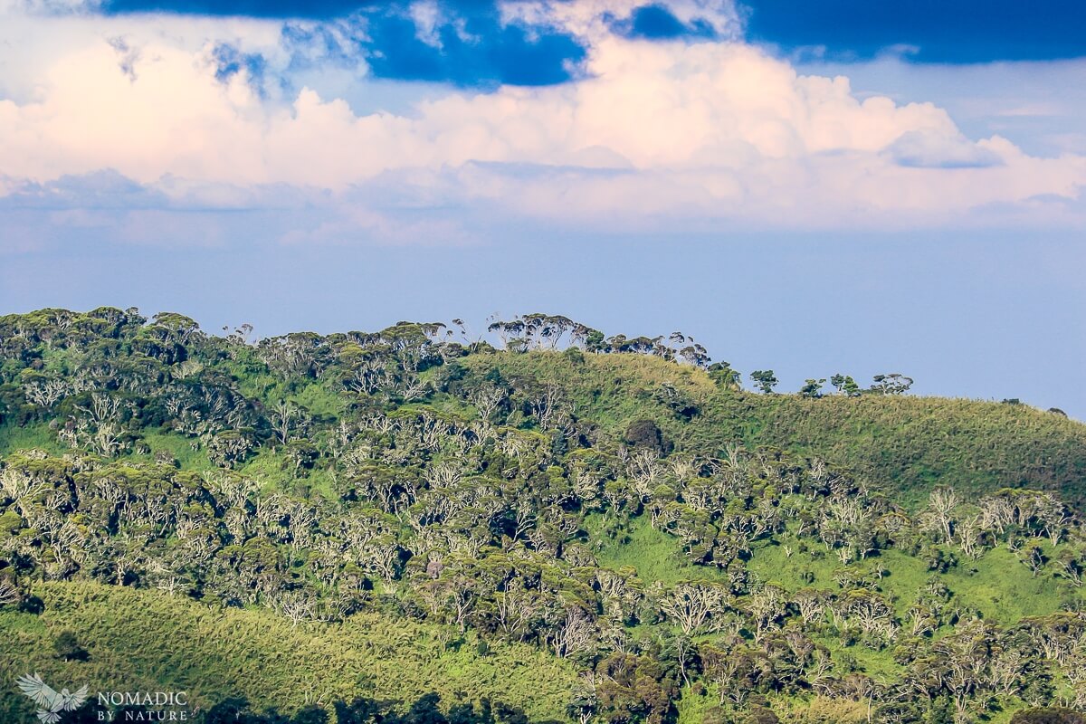The trail zig zags back down below the mists, and we hear the rushing of the river again. As the giant bamboo starts appearing in the heathers, we arrive at Samalira Camp, which provides vast views over the jungles below, all the way out to the haze of farmlands beyond the park boundaries. The sun warms the air and the ground, and we lay out everything we have on grass, logs, and tree branches, drying our clothing for the first time in days.