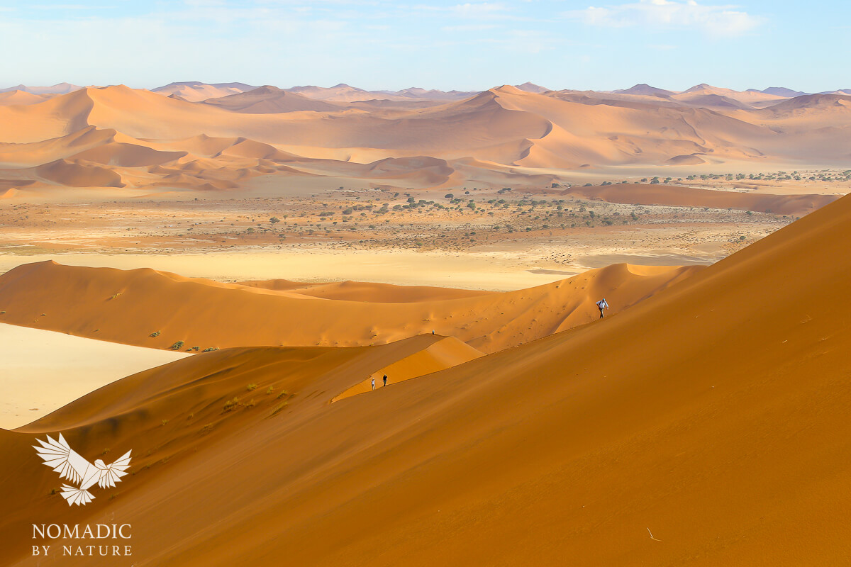 Tightrope walking dune crests induces vertigo, and each step into the silky sand sinks you back down the slope like moonwalking in mud. However, the view from the top of Big Daddy Dune is worth the effort. To the west, you look over endless dunes flowing all the way to the horizon, back to the east you can see little people the size of ants, huffing and puffing up the dune crest after you.