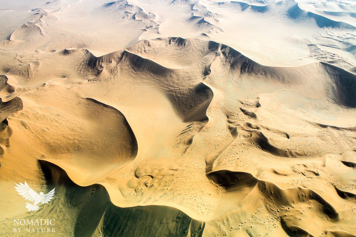 Flying over the Namib Nauluft National Park around Sossusvlei, you glide over artful wisps of star and crescent shaped dunes. They seem to be connected in long scripts as if purposefully painted by a calligrapher’s brush. For those that can decipher this “Sand-skrit”, they tell ancient tales of wind and rain in geological time.