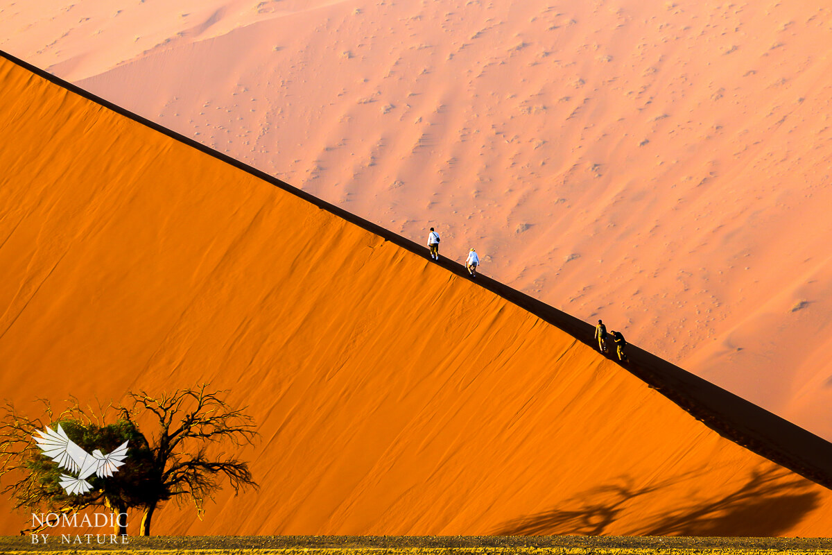 My favorite adventure in Sossusvlei is climbing Big Daddy Dune at dawn before the desert heat sets in, and then running down the slip face into Dead Vlei at the bottom. Entering the dunes on foot to explore these places triggers a dreamlike state. The heat bakes your brain, your sweat sizzles off your skin, and everywhere looks exactly the same in this endless sandy maze.