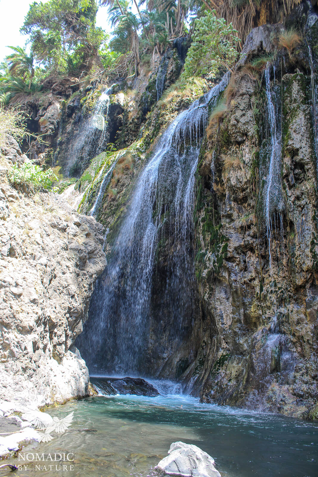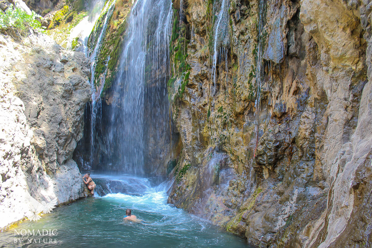 The trail leads to a natural spring, which flows into a 20-meter waterfall. The waterfall veils the entrance to a slot canyon, and you can climb behind the falls and follow the canyon to a secret swimming hole with another waterfall cascading into it. It is a worthy setting for a fairy tale.