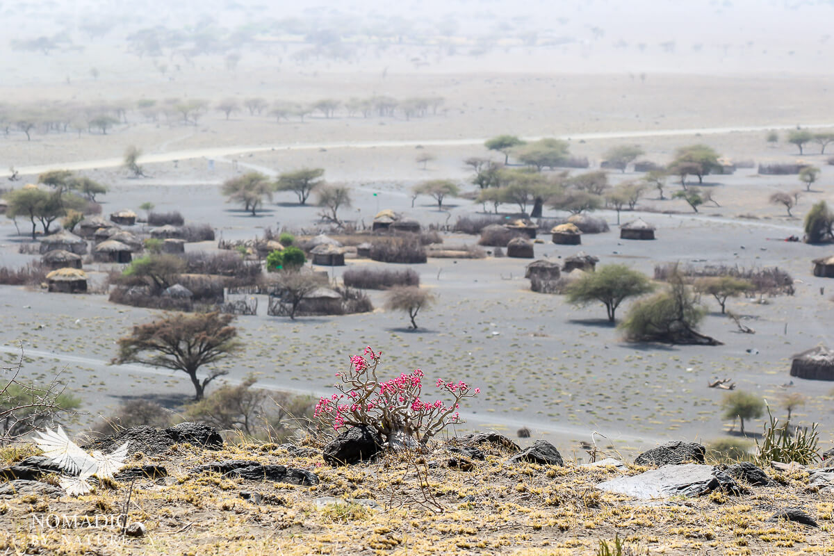 The escarpment to the west of the lake is a sanctuary, providing some of the only shade and fresh water in the region. Veins of jade run through the rocks, and the bright pink flowers of the desert rose add vibrancy to the otherwise stark and dusty landscape.