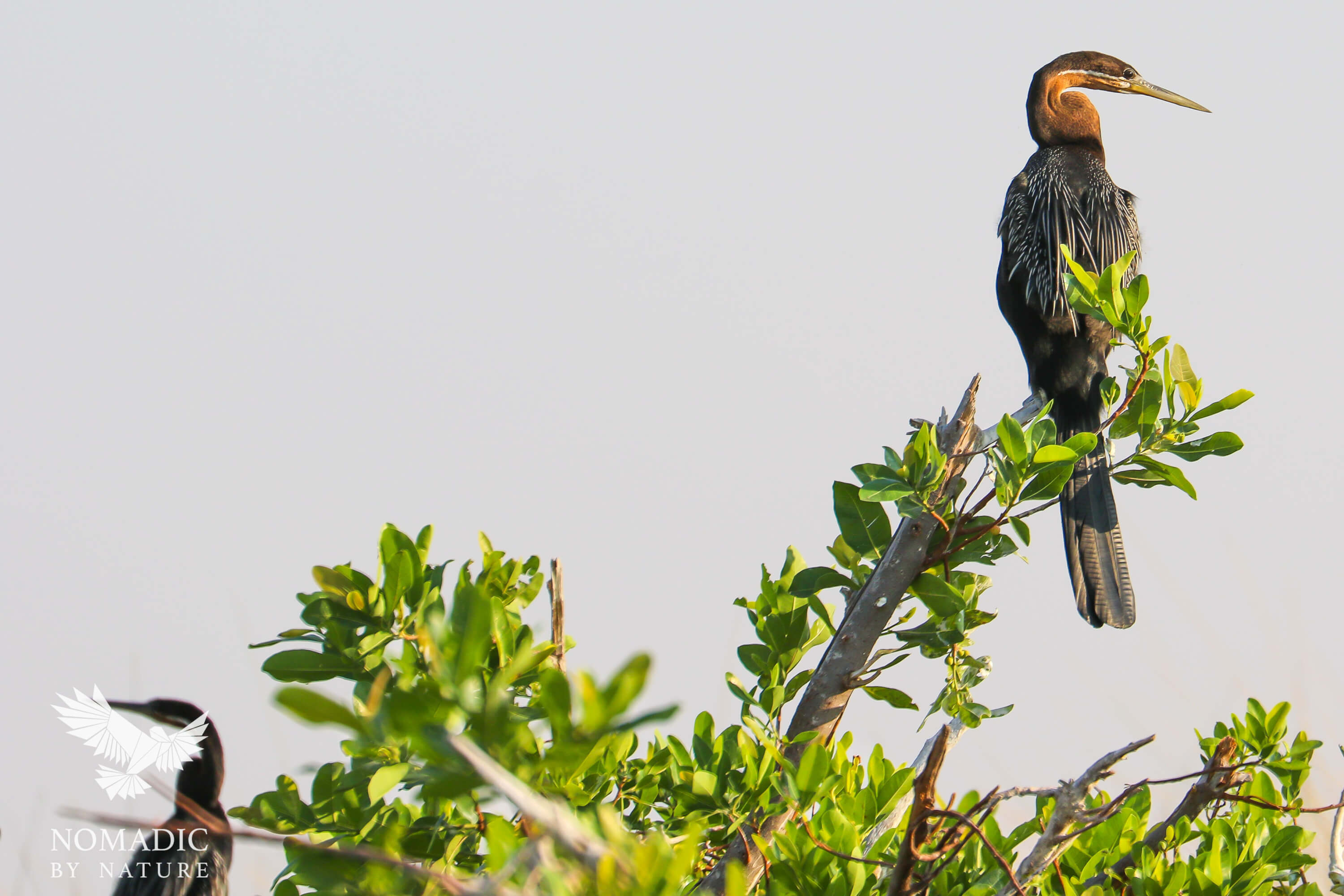 When the water in the Okavango Delta is high, it is an alluvial fan with marshy islands in the middle, and finger lakes extending far into northern Botswana. Day lilies dot the water, and mokolwane palms and papyrus reeds line the waterways. The reeds are gently swayed in the direction of the current, and cast a golden reflection on the water under the morning light. Crocodiles lurk in the lily pads, and the African Darter torpedoes through the water spearing fish.